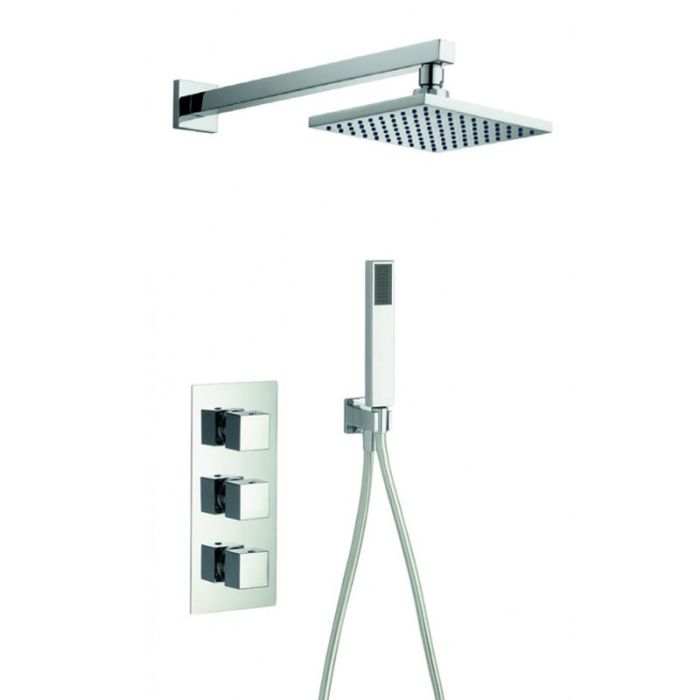 Bloque2 3 Knob Twin Outlet Concealed Thermostatic Valve with 200mm Fixed Head, Pencil Handset and Smooth Hose
