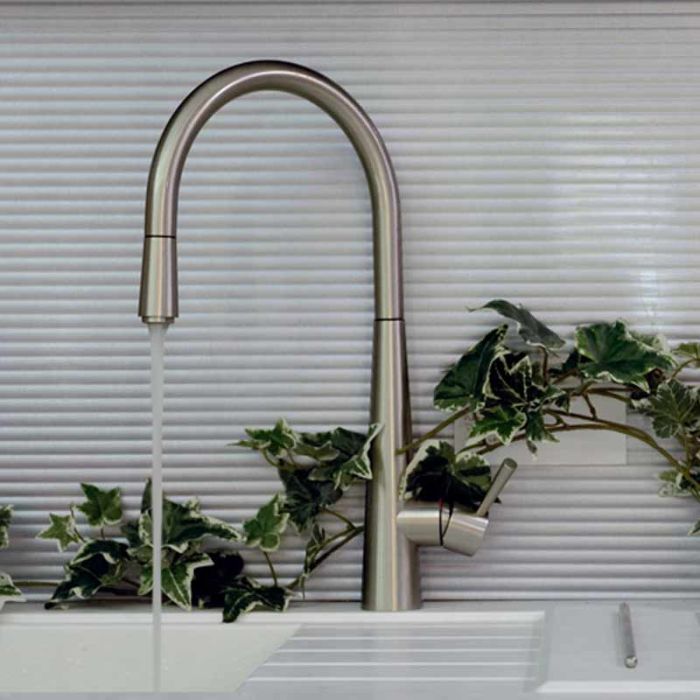 The Gessi Just monobloc sink mixer with swivel spout and pull out spray is available in chrome or Brushed Steel and is suitable for high pressure water systems only and requires a minimum operating pressure of 1.0 bar.