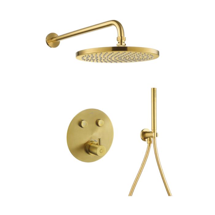 Flova UK GoClick flow control 2-outlet round shower valve with fixed head and handshower kit in brushed gold (BB-LVT2WPK3-RO-V)