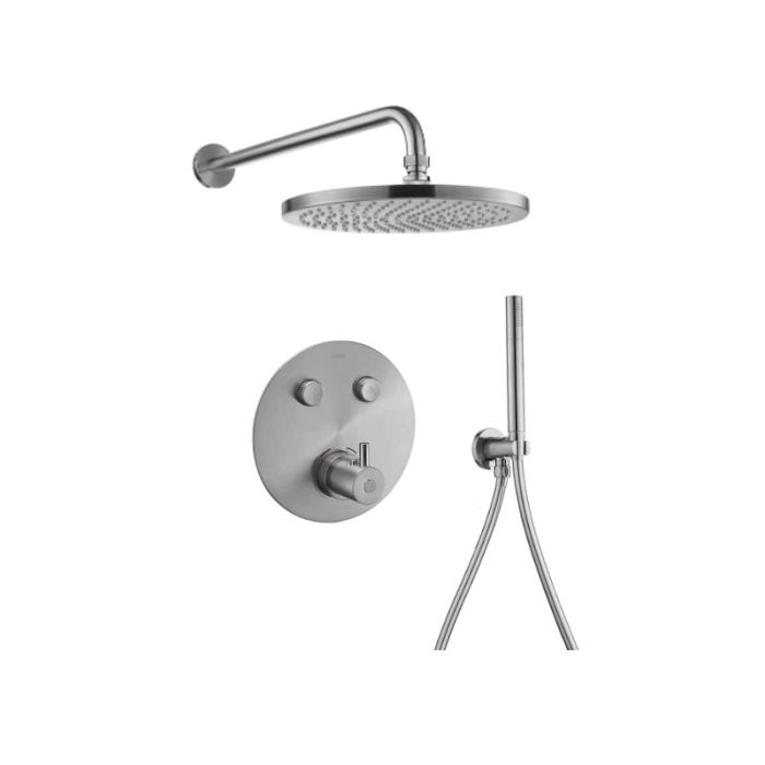 Flova UK GoClick flow control 2-outlet round shower valve with fixed head and handshower kit in brushed nickel (BN-LVT2WPK3-RO-V)
