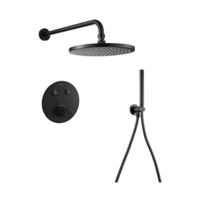 Flova UK GoClick flow control 2-outlet round shower valve with fixed head and handshower kit in matt black (MB-LVT2WPK3-RO-V)