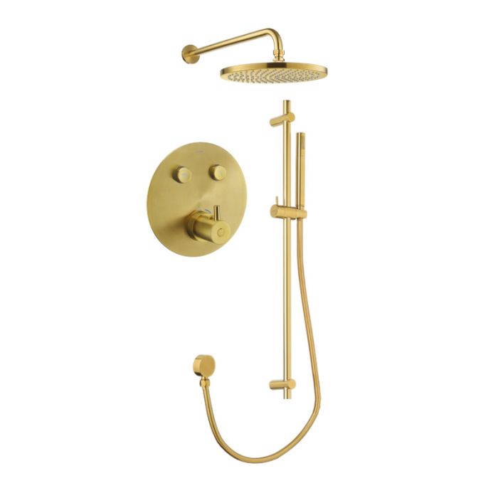 Flova UK GoClick flow control 2-outlet round shower valve with fixed head and sliderail kit in brushed gold (BB-LVT2WPK4-RO-V)