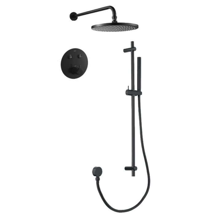Flova UK GoClick flow control 2-outlet round shower valve with fixed head and sliderail kit in matt black (MB-LVT2WPK4-RO-V)