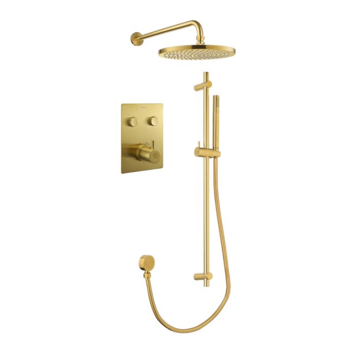 Flova UK GoClick flow control 2-outlet square shower valve with fixed head and sliderail kit in brushed gold (BB-LVT2WPK4-SQ-V)