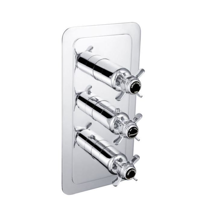 Just Taps Plus - Grosvenor Pinch Vertical Three Handle Two Outlet Thermostatic Shower Valve in Chrome with Black Indices (GB98690)