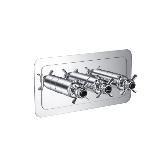Just Taps Plus - Grosvenor Pinch Horizontal Three Handle Three Outlet Thermostatic Shower Valve in Chrome with Black Indices (GB98692)