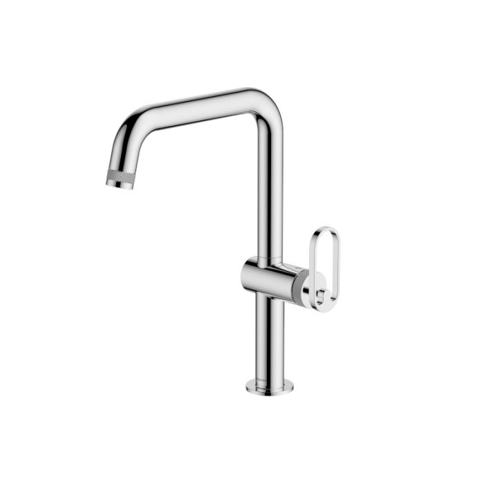 The Juno is the latest generation of taps which boasts a slimline modern design with high-set controls. This progressive tap announces its industrial aesthetics with a futuristic control handle and knurling on the valve cover.