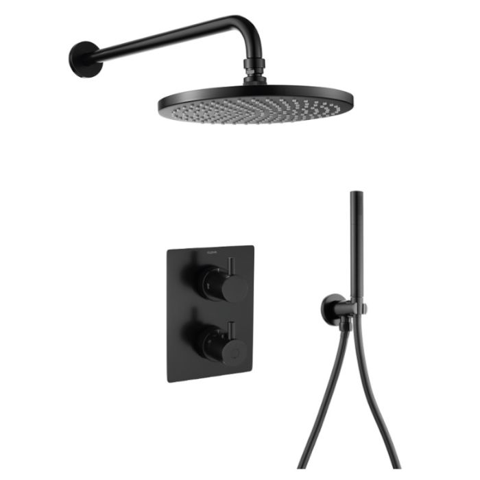 Flova UK Levo thermostatic 2-outlet square shower valve with fixed head and handshower kit in matt black (MB-LVT2WPK1-SQ-U)