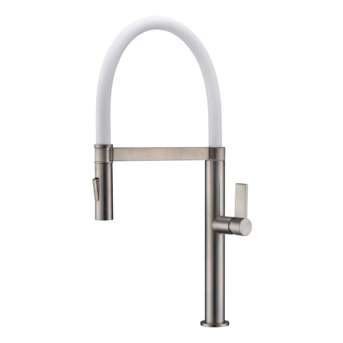 - Brushed nickel finish and white silicon tube spout