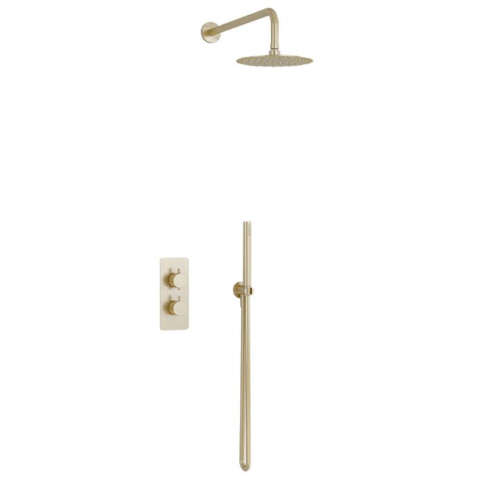 Imex Ceramics (Previously Pura Bathrooms) Ravine Dual Diverter Concealed Thermostatic Valve with 200mm Fixed Head, Pencil Handset & Smooth Hose in Brushed Brass (RAVCVPK005BB)