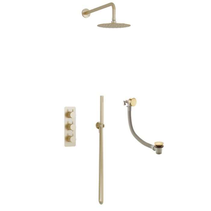 Imex Ceramics (Previously Pura Bathrooms) Ravine 3 handle, triple diverter concealed thermostatic valve with 200mm fixed head, pencil handset, smooth hose & overflow bath filler with waste in brushed brass (RAVCVPK10BB)