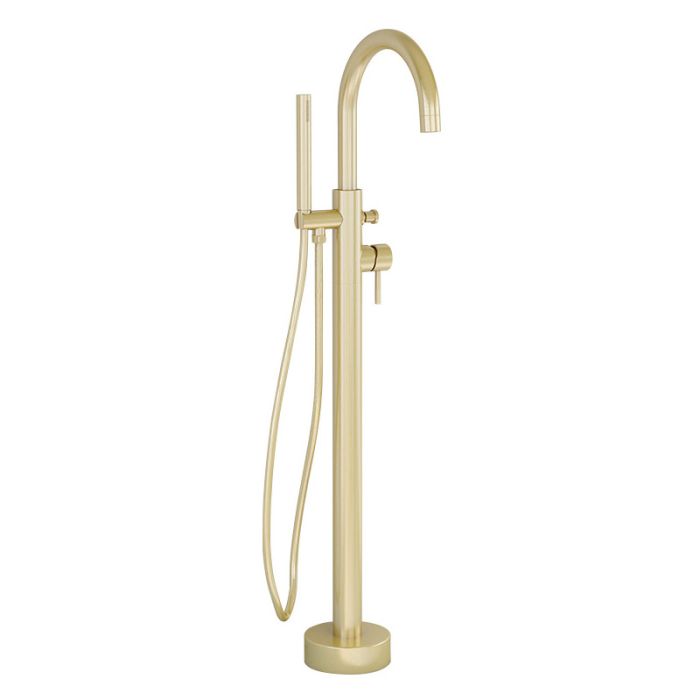 Imex Ceramics (Previously Pura Bathrooms) Ravine Floor Standing Bath Shower Mixer with Handset, Hose & Bracket in Brushed Brass (RVFSBSMBB)