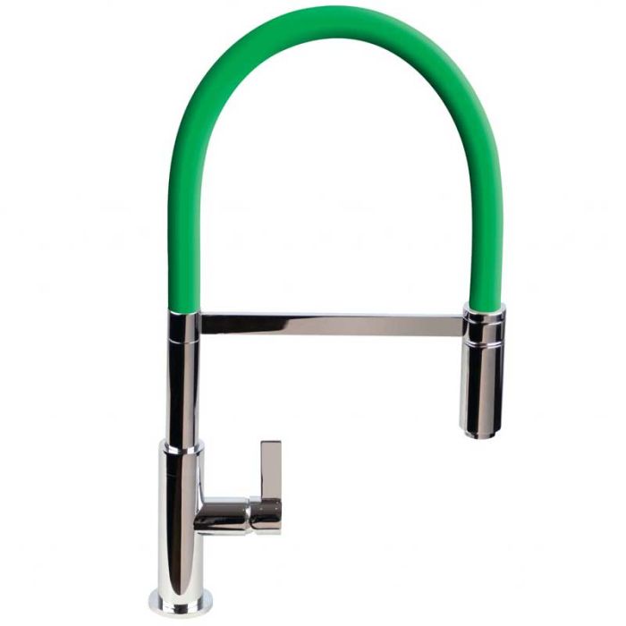The 1810 Company Spirale Flexible Spout Kitchen Sink Mixer in Brushed Steel and Green Spout. Shown in Chrome for illustration purposes