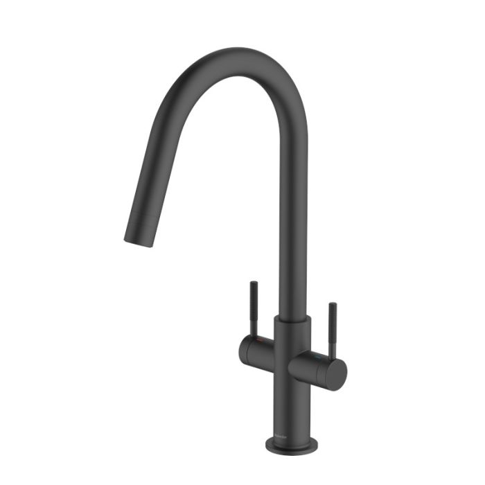 Clearwater Topaz J-Spout Twin Lever Monobloc Kitchen Tap with Swivel Spout and Twist & Spray Aerator in Matt Black (TOP20MB)