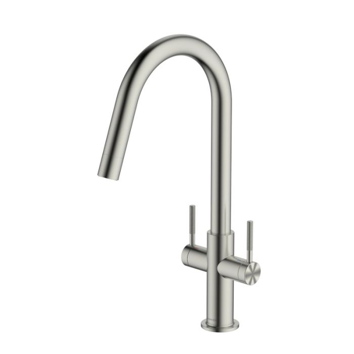 Clearwater Topaz J-Spout Twin Lever Monobloc Kitchen Tap with Swivel Spout and Twist & Spray Aerator in Brushed Nickel (TOP20BN)