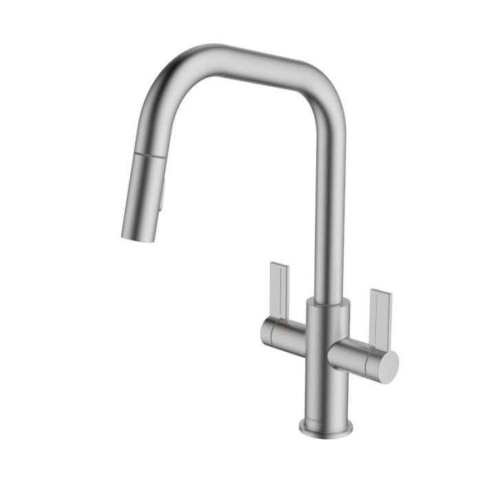 Clearwater Kira Pull-Out Spray U-Spout Twin Lever Monobloc Kitchen Tap with Swivel Spout in Brushed Nickel (KIR20BN)